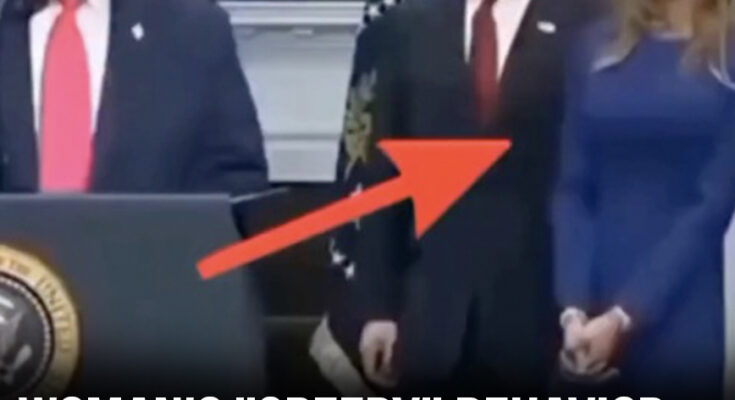 A resurfaced clip from a White House press conference has sent social media into a frenzy – not over policy or politics, but over the “possessed” billionaire philanthropist who’s standing just feet away from President Donald Trump.