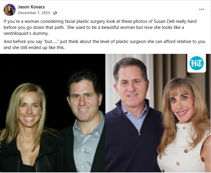 “If you’re a woman considering facial plastic surgery look at these photos of Susan Dell really hard before you go down that path,” one user warned in a Facebook post that showed before and after photos of the mother of four. “She used to be a beautiful woman but now she looks like a ventriloquist’s dummy.”