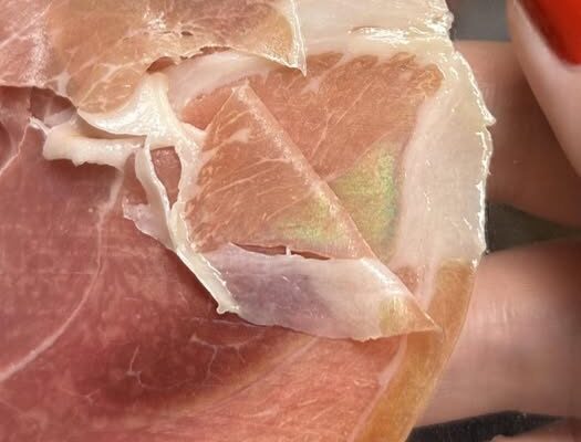 The colorful shimmer is typically just light reflecting off smooth, thin slices of cured meat.