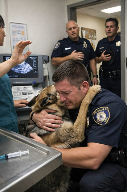 Officer Alex Voronov entered the room and held his service dog gently pressed against his chest. The German Shepherd, named Rex, weighed nearly forty kilos, but now the man held him as if he were a small puppy.